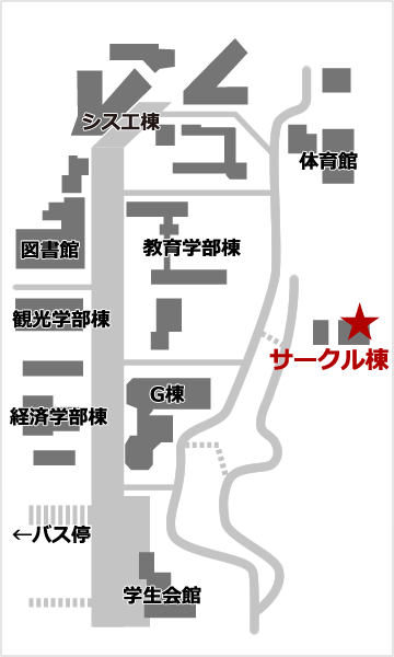 和歌山大学第1サークル棟、向かって左の2階 奥から2番目の部屋がmycomの部室です。