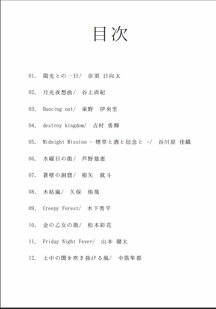 夜空に浮かぶ月に、今日も人々は思いを馳せる。 幻想的な雰囲気を目指しました。主旋律のリフレインが若干 くどいですが、曲の途中に調やテンポを変更して、単調なメ ロディーの繰り返しにならないように工夫しました。もう少 しこだわりたかった部分(特に音源)はありますが、それは 来年以降の自分への課題とします。 読み方は「やそうきょく」「ノクターン」どちらでもいいです。 好きな風に読んでください。