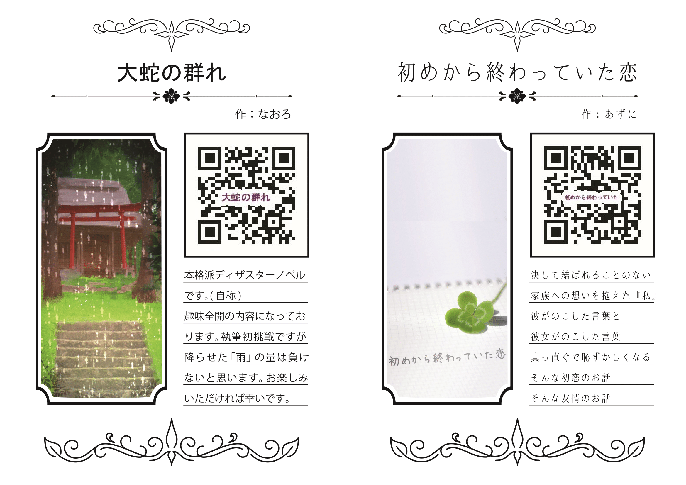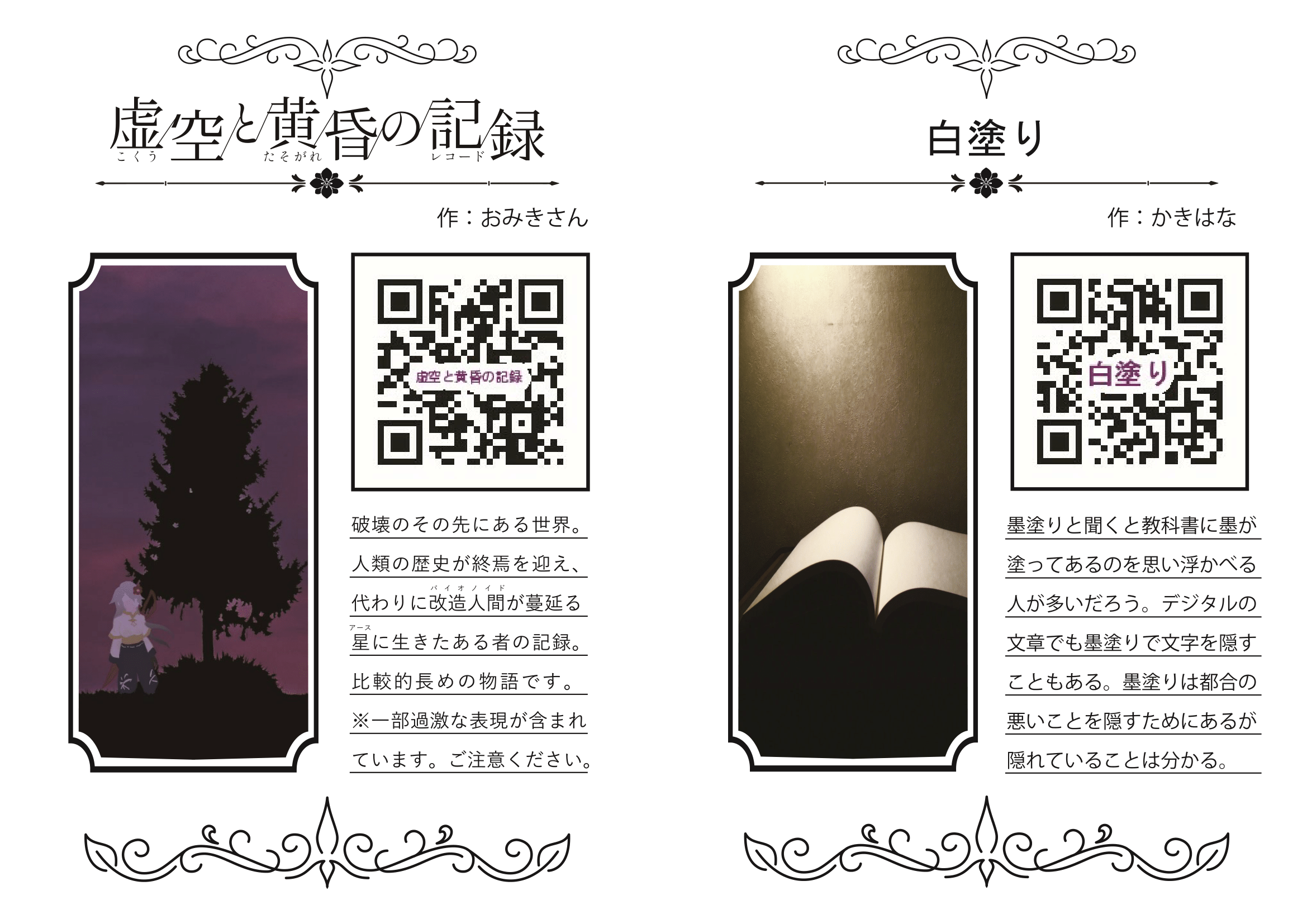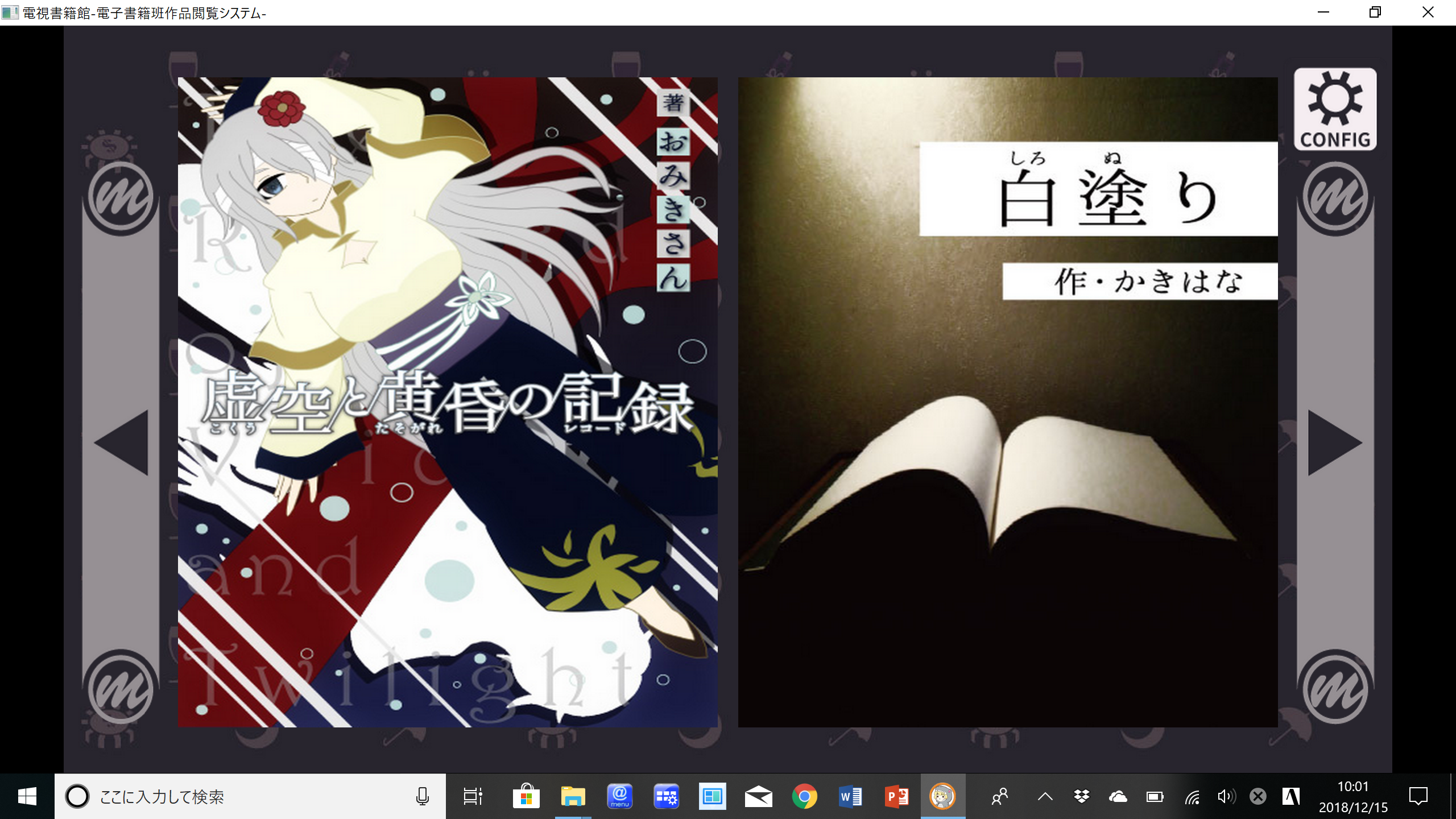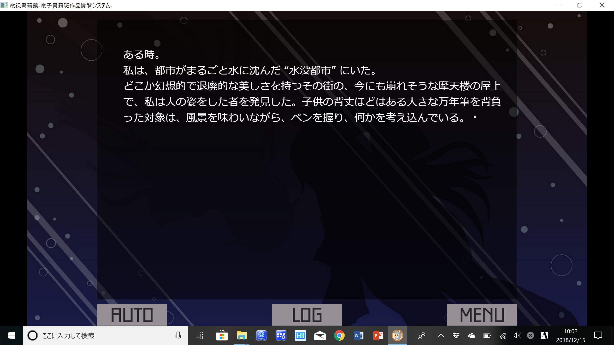 電子書籍班では電子書籍で小説を閲覧することができます。 以下のサイトから作品をダウンロードすることもできます。 ダウンロードサイト mycom電子書籍班の作品をノベルゲーム風に試し読みできるソフトも作成しました。 作品ごとに書き下ろされたBGMと共に、楽しんで頂けたら幸いです。