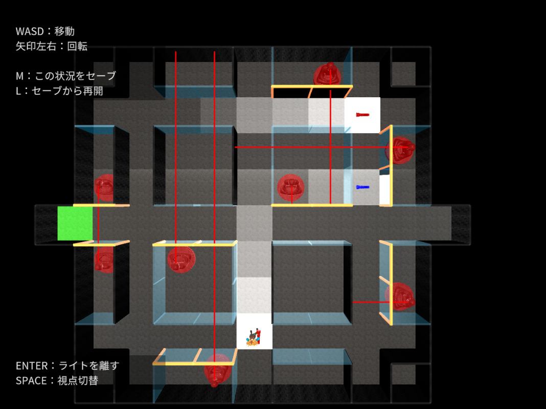 W:前移動, A:左移動, S:後ろ移動, D:右移動, Space:視点切り替え
