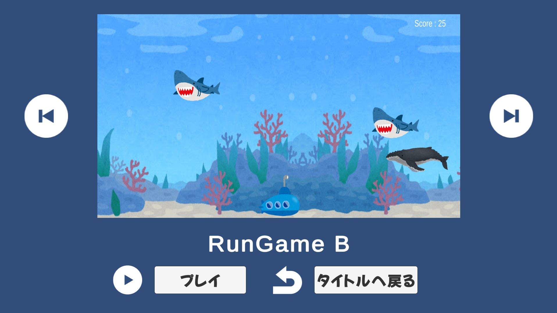 敵(サメなど)を避けながら潜水艦を進める。敵に当たったらゲームオーバー。